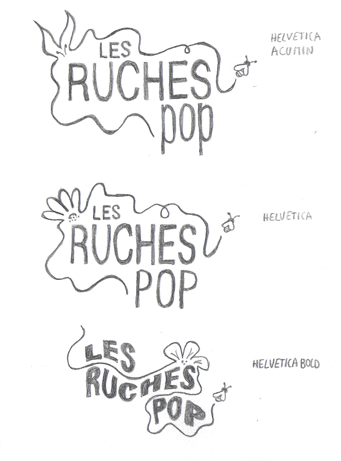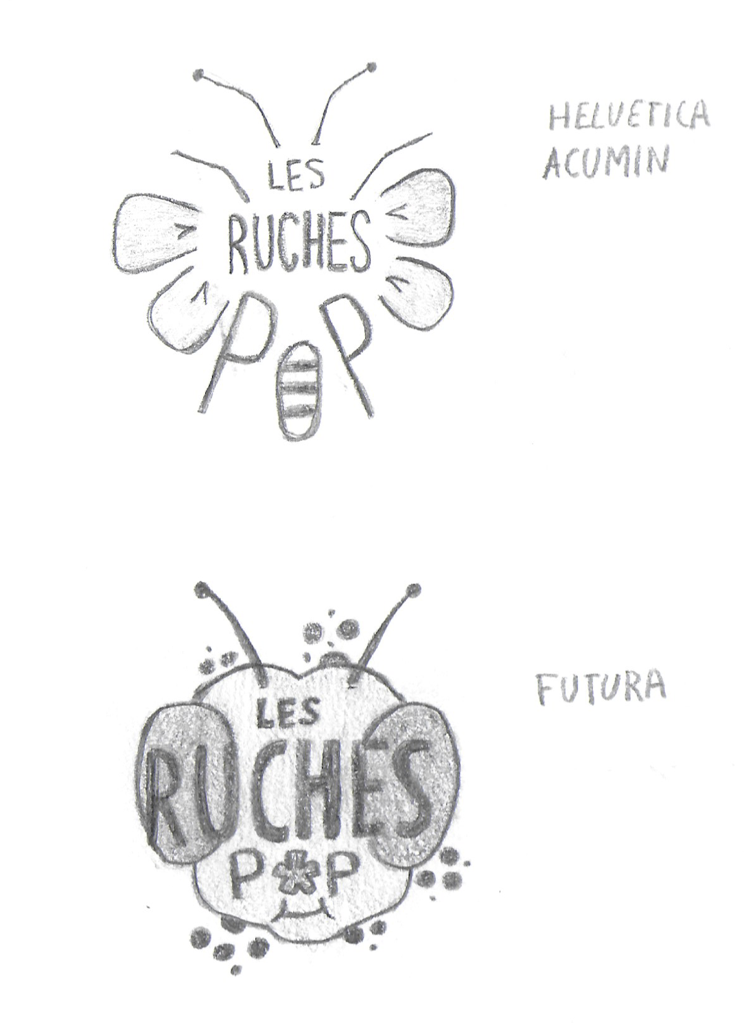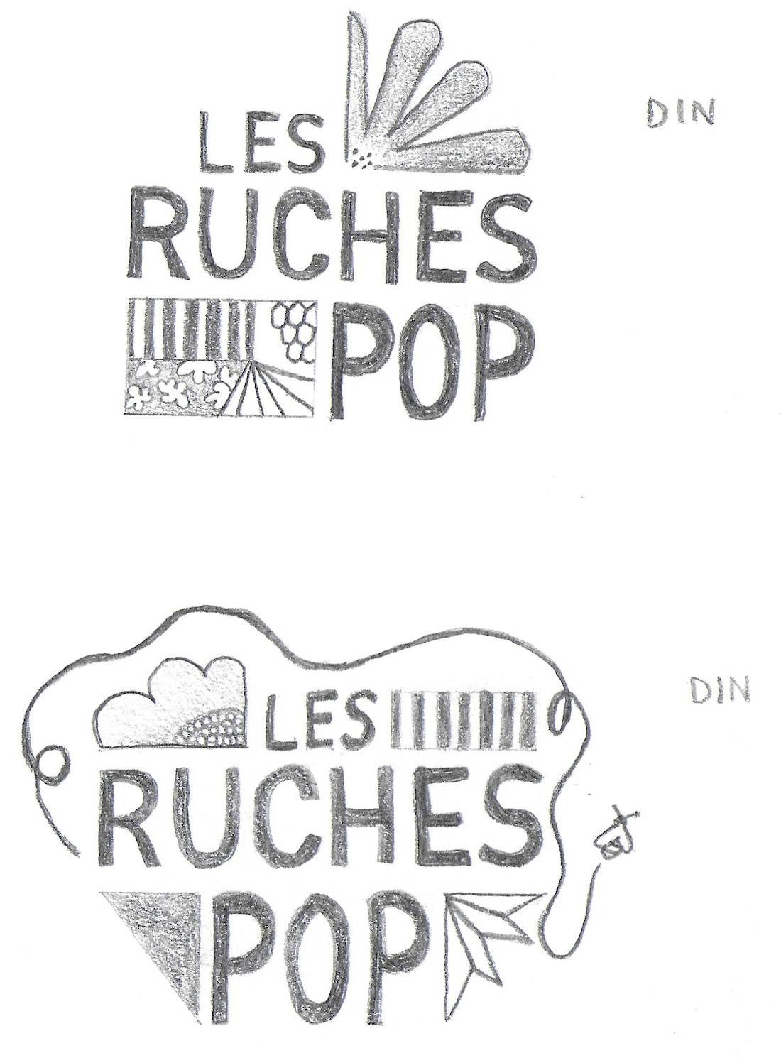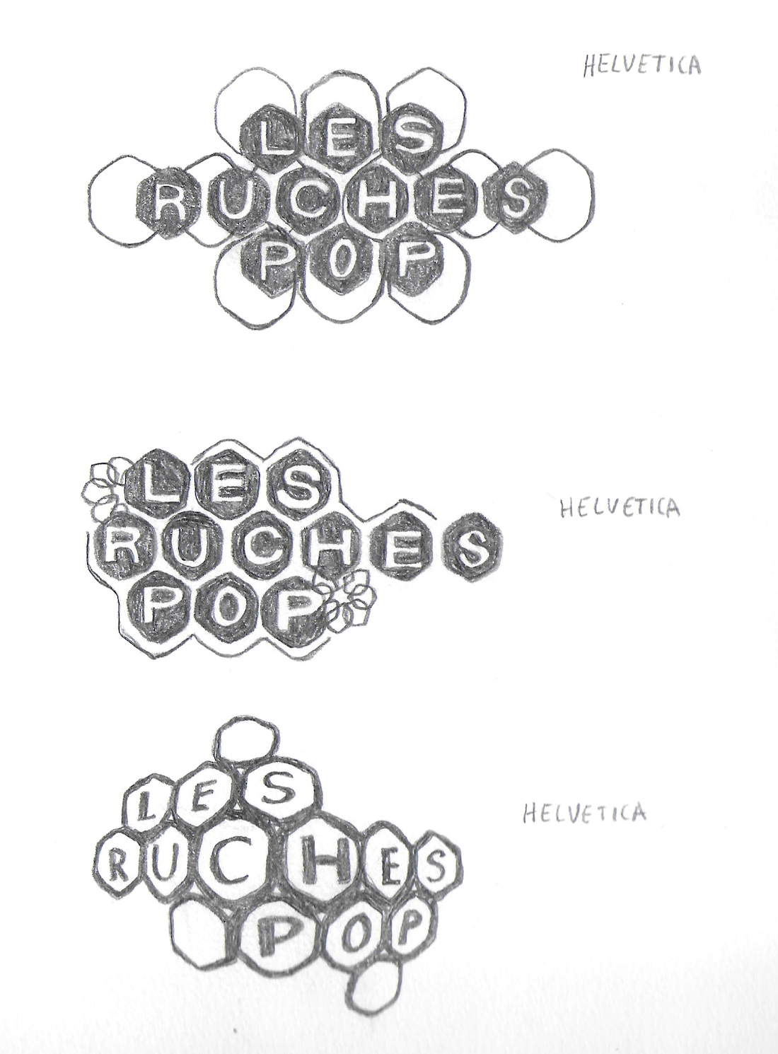 Les croquis montrent l'évolution du signe : du figuratif vers une synthèse graphique symbolisant à la fois l'alvéole et le réseau social que crée l'association dans le 19ème arrondissement.